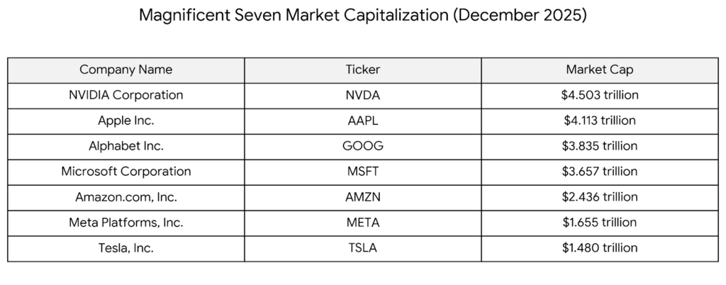 Each of the Magnificent Seven is worth more than $1 trillion, together they make up more than a third of the S&P 500. This level of wealth concentration in a single sector of just a few companies is unprecedented. Apple alone made $416 billion in revenues in the 2025 fiscal year, which is approximately the gross domestic product of Denmark. In other words, Apple, a single company, generates economic activity like a midsize European country. If the top seven technology giants, with aggregate annual revenues of over $2 trillion, were a national economy, they would rank among the top 15 economies in the world, comparable to nations like Russia, Canada, or Brazil.